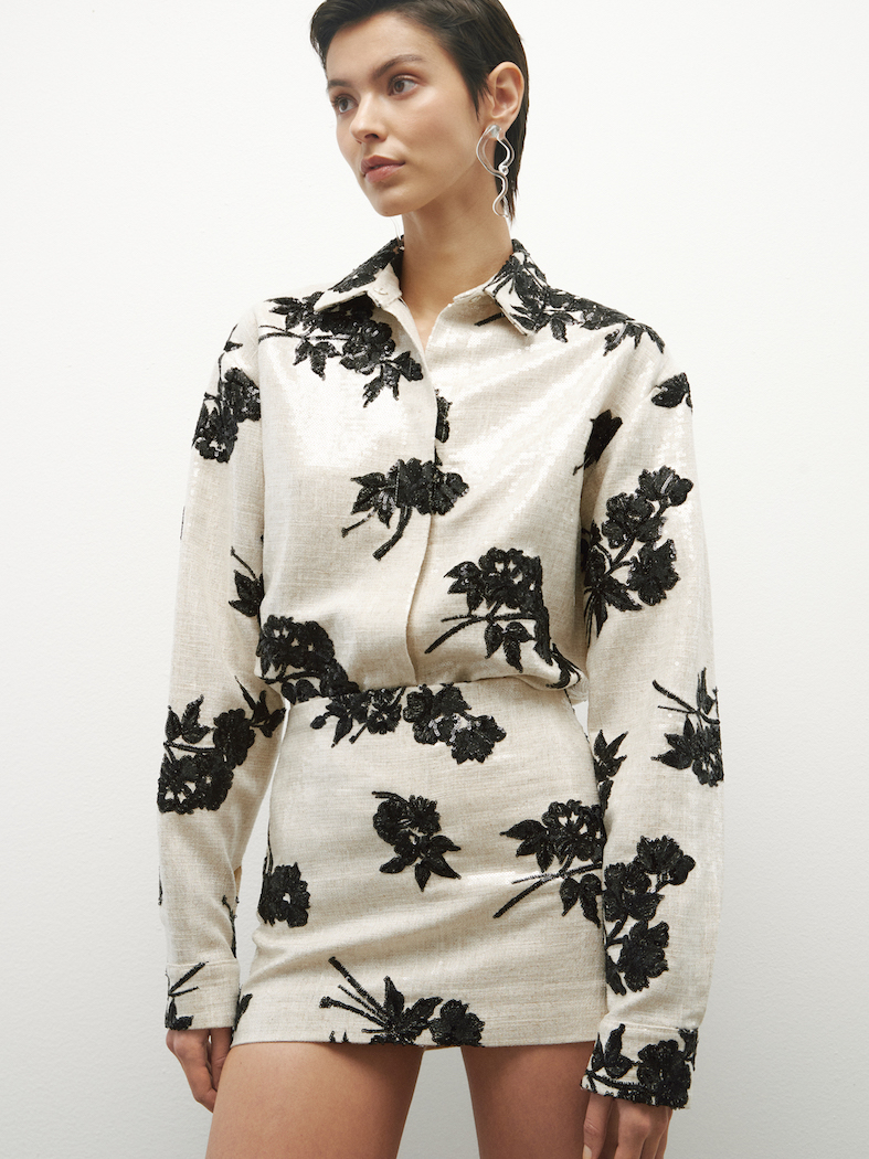 Mini falda low waist realizada en tejido de lino con pailletes transparentes y flores bordadas en negro. Cierre con cremallera invisible en espalda. 87% viscosa. 13% lino