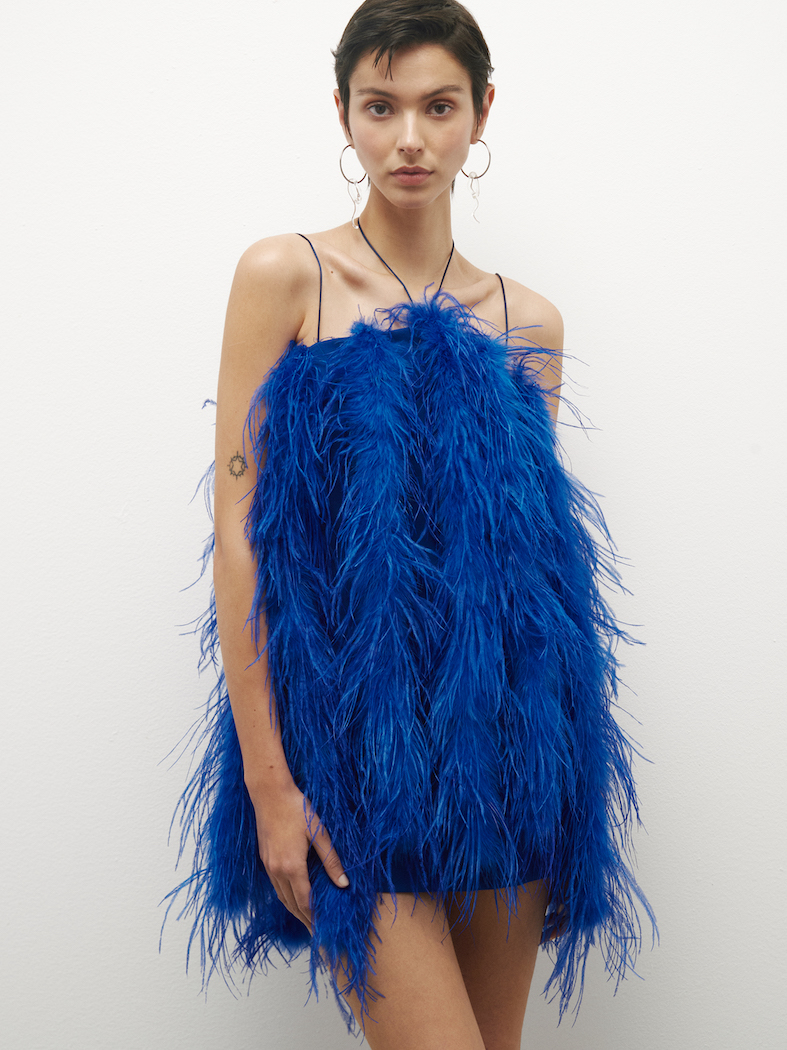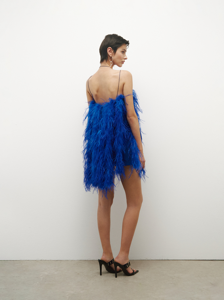 Mini vestido con tirantes en hombros y cuello de plumas naturales con base realiza en tejido sartorial. Bolsillos en costuras laterales y cremallera invisible en espalda.